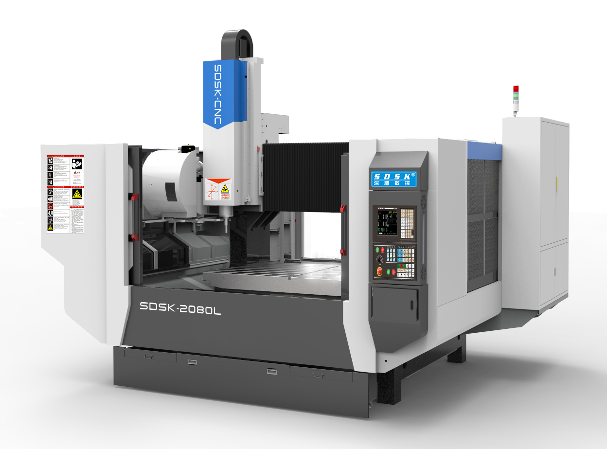 SDSK-L機型系列是專門為客戶量身定做的龍門加工中心;配有臺灣圣杰24刀臂式刀庫; 換刀速度為2運動方式為Y軸工作臺前后移動,X機頭左右移動,Z軸上下移動。 機身采用頂級的濟南花崗巖(大理石)結構、永遠不變形;三軸采用進口臺灣上銀精密級直線導軌,臺灣TBI  研磨級滾珠絲桿,德國聯軸器,伺服電機,配電柜恒溫系統,先進的主軸制冷系統,自動潤滑系統,冷卻液循環噴水和噴霧系統,空氣過濾裝置,保證了更高的加工精度、速度與穩定性;特別適用于各類銅、鋁、壓克力、塑料等零件的精密精雕、雕銑、摩擦攪拌焊、擴孔、鉆孔、攻絲加工。