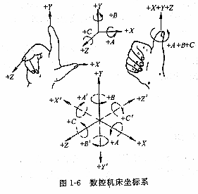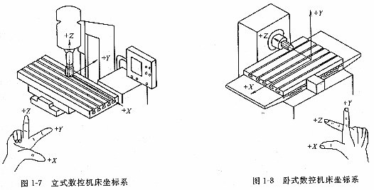 數(shù)控機(jī)床各軸的標(biāo)示乃是根據(jù)右手定則。當(dāng)右手拇指指向正X軸方向,食指指向正Y軸方向時(shí),中指則指向正Z軸方向。圖1-7所示為立式